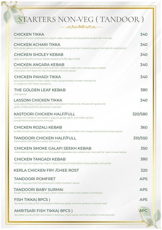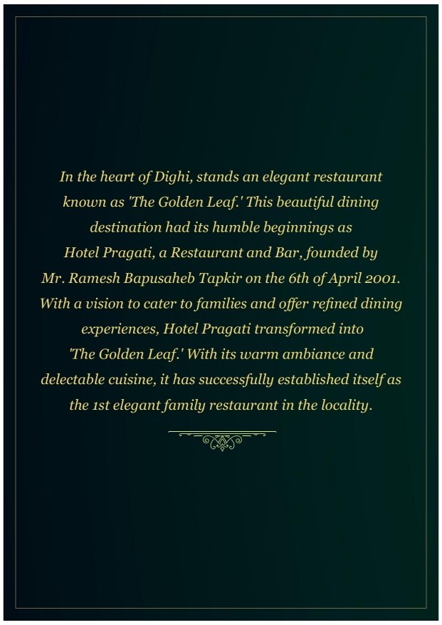 Welcome to The Golden Leaf, where culinary excellence meets refined elegance in every aspect of your dining experience. Our restaurant beckons discerning guests to embark on a journey of gastronomic delight unlike any other. From the moment you step through our doors, you are enveloped in an ambiance of sophistication and warmth, where every detail is meticulously curated to ensure your satisfaction.